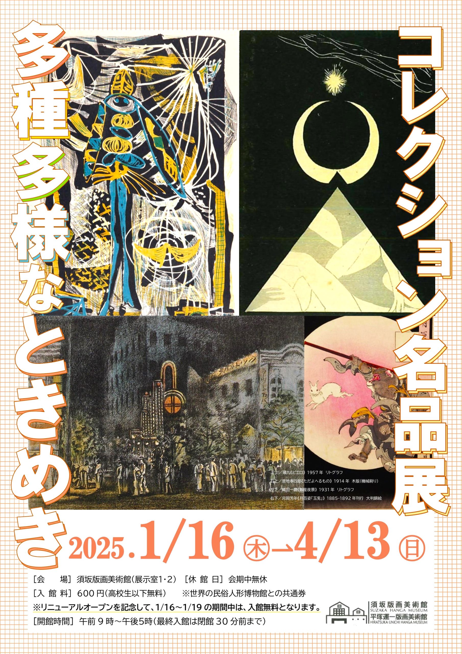 一括りに「版画」といっても、非常に多種多様な作品があります。本展では、収蔵品の中から時代・技法・色彩・題材などの違いにより個性がバラバラな版画作品を、一作家一作品に厳選してご紹介します。版画作家たちが情熱を注いで生み出した名品の数々を通じて、版画の奥深さや美しさを改めて感じていただければ幸いです。