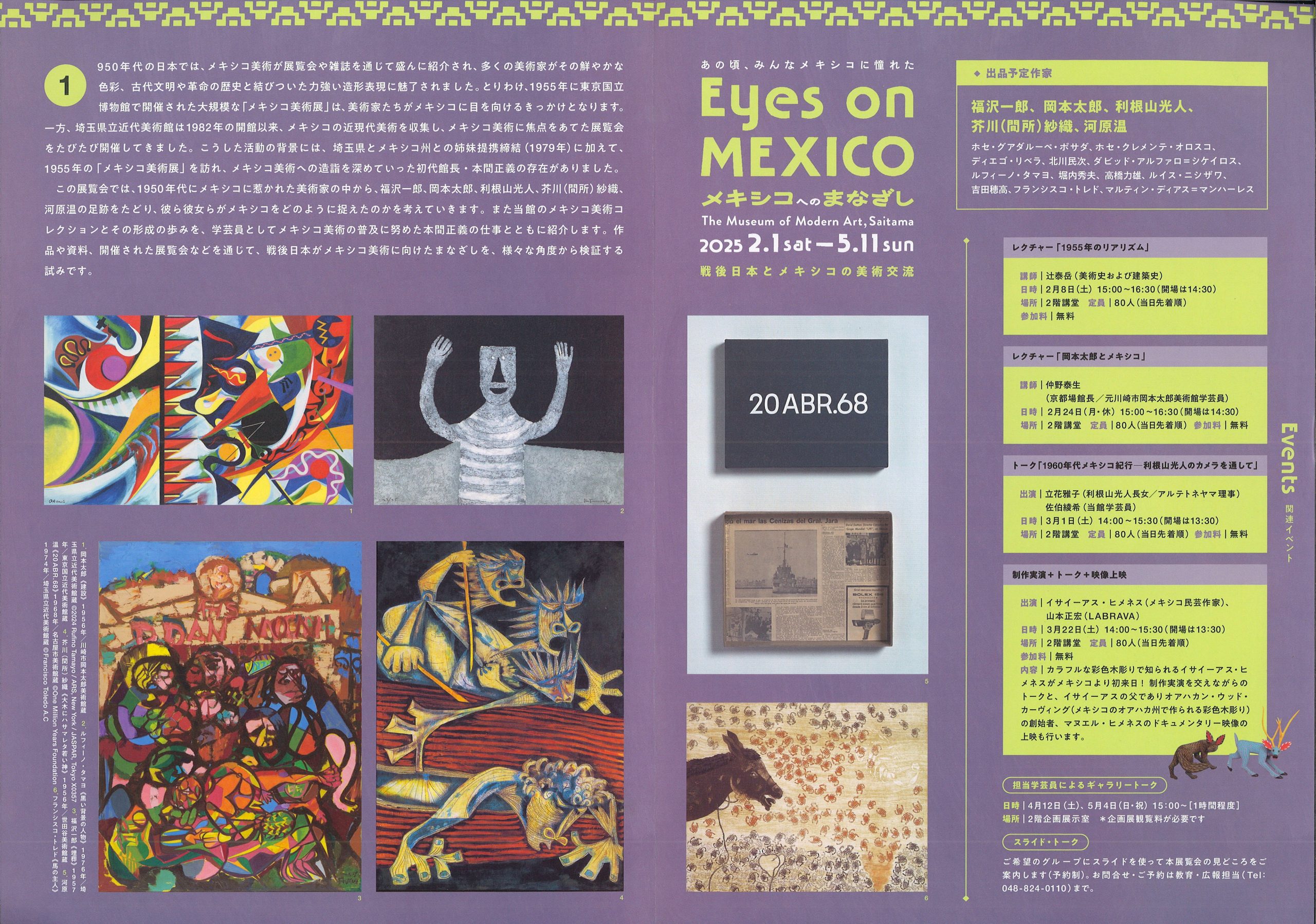 一方、埼玉県立近代美術館は1982年の開館以来、メキシコの近現代美術を収集し、メキシコ美術に焦点をあてた展覧会をたびたび開催してきました。こうした活動の背景には、埼玉県とメキシコ州との姉妹提携締結(1979年)に加えて、1955年の「メキシコ美術展」を訪れ、メキシコ美術への造詣を深めていった初代館長・本間正義の存在がありました。