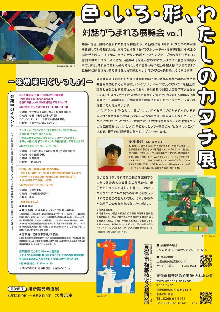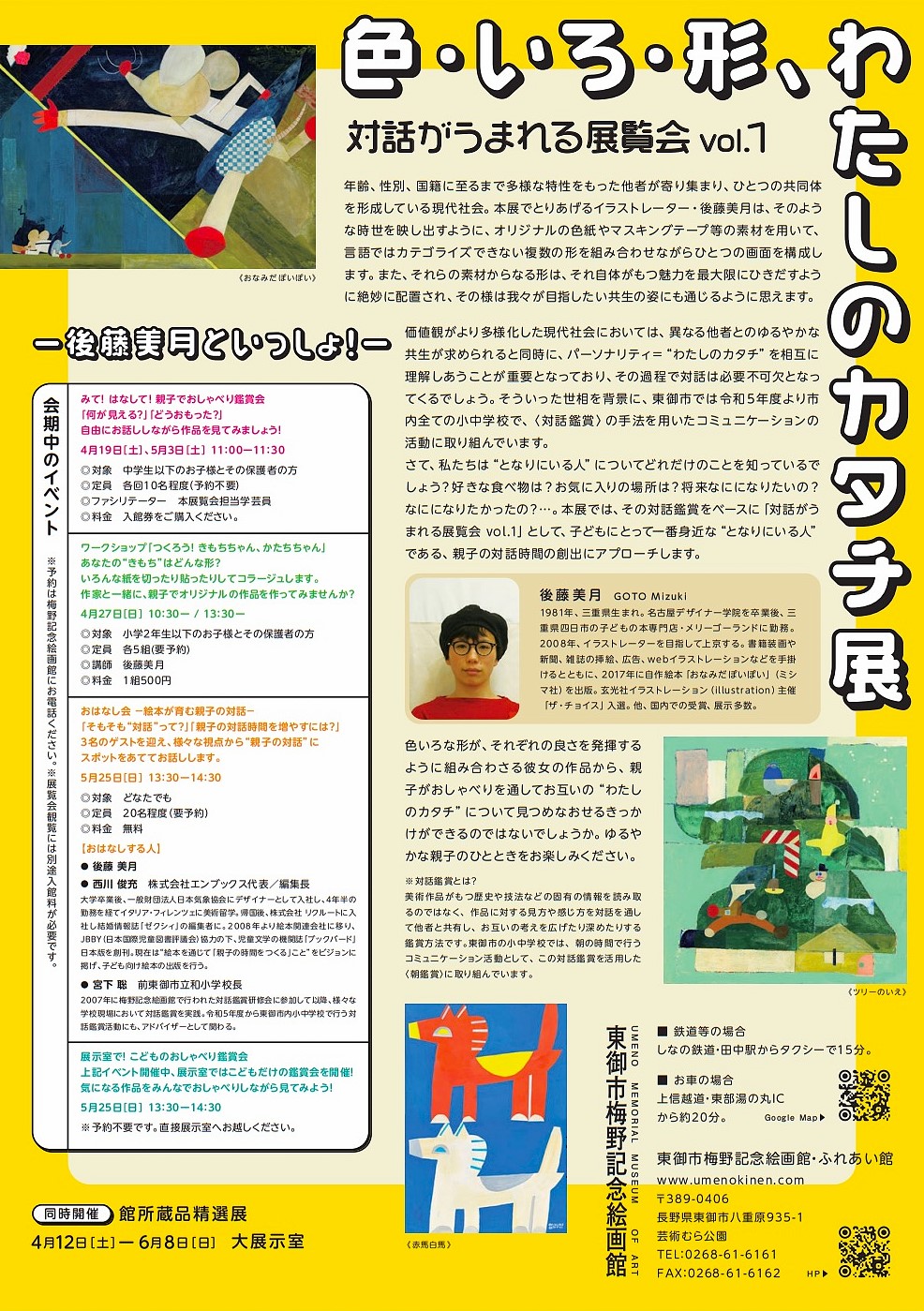 年齢、性別、国籍に至るまで多様な特性をもった他者が寄り集まり、ひとつの共同体を形成している現代社会。本展でとりあげるイラストレーター・後藤美月は、そのような時世を映し出すように、オリジナルの色紙やマスキングテープ等の素材を用いて、言語ではカテゴライズできない複数の形を組み合わせながらひとつの画面を構成します。また、それらの素材からなる形は、それ自体がもつ魅力を最大限にひきだすように絶妙に配置され、その様は我々が目指したい共生の姿にも通じるように思えます。