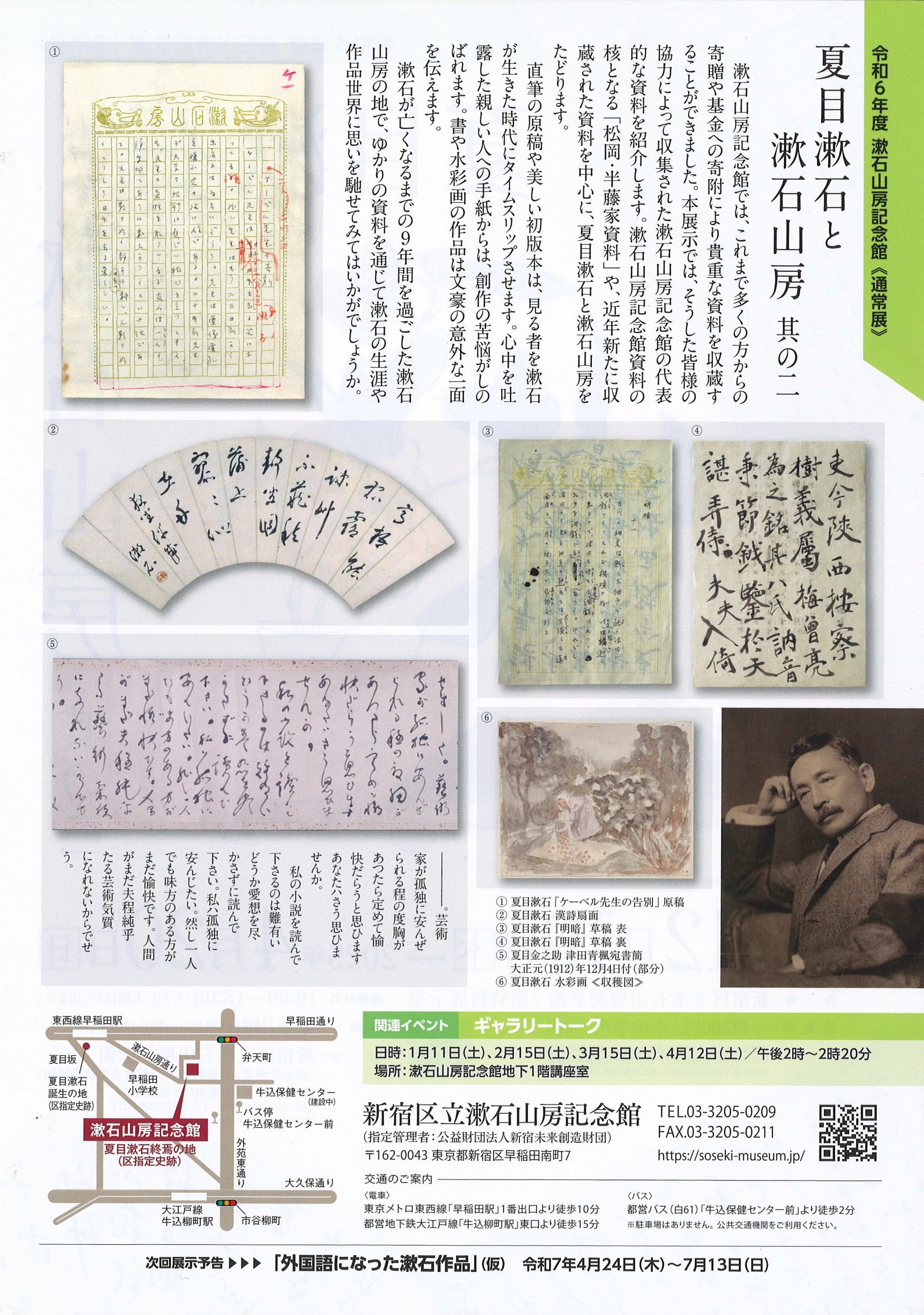 漱石山房記念館が所蔵する代表的な資料と、令和5年度の新収蔵資料を展示します。