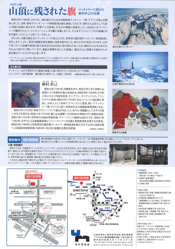 あれから41年目になります。山中で見つかった装備や登頂の証である日の丸は日本に持ち帰られましたが、植村さんはいまもあの大きな山に抱かれて眠っています。最後の挑戦を共にした装備に、極北の山に挑戦する植村さんの姿を重ねていただければと思います。