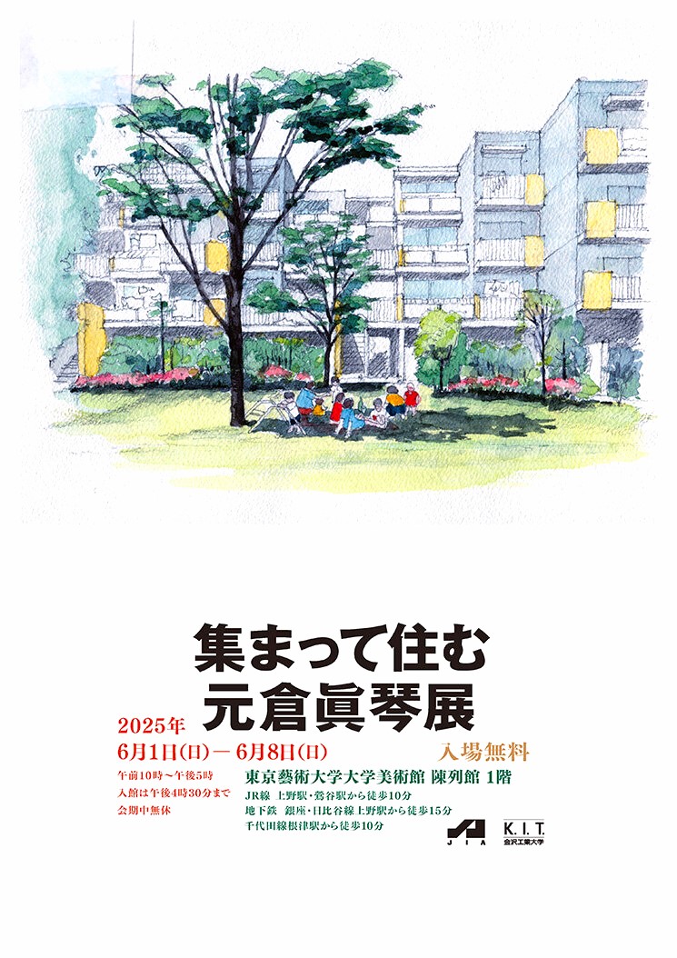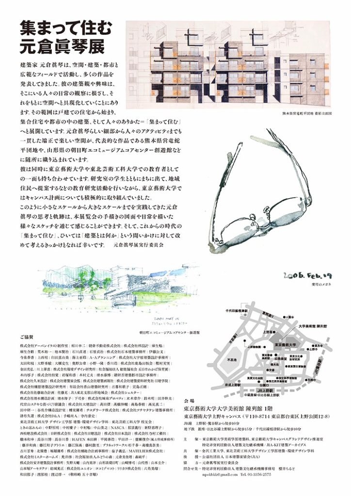 このように小さなスケールから大きなスケールまでを実践してきた元倉眞琴の思考と軌跡は、本展覧会の手描きの図面や日常を描いた様々なスケッチを通じて感じることができます。そして、これからの時代の「集まって住む」、ひいては「建築とは何か」という問いかけに対して改めて考えるきっかけとなれば幸いです。