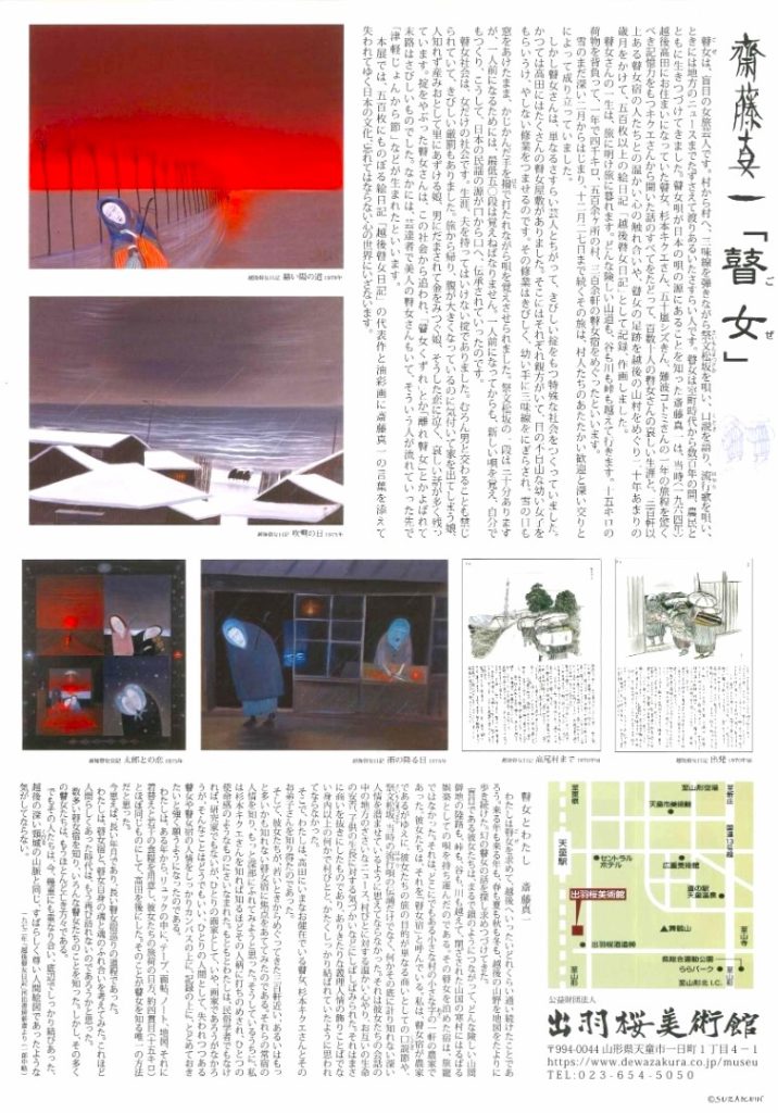 瞽女 (ごぜ) は三味線を抱え北陸や東北の農村や山村を訪れて、流行 (はやり) 歌を唄い、隣村の話題を届けて娯楽を運んだ盲目の女性旅芸人です。室町時代から続く文化だと知った斎藤真一は、越後高田にわずかに残っていた瞽女さんの話を聞き、暗黒の世界で地を這うような生活をしながらも、常に感謝の気持ちを忘れず互いに支え合っていた瞽女さんの人柄に惹かれて、一人一人の瞽女さんの記録を残そうと1961年から20年にも及ぶ歳月をかけて瞽女の足跡を巡り、百数十人の瞽女の哀しい生涯と、瞽女宿の人たちとの温かい心の触れ合いを作画しました。
