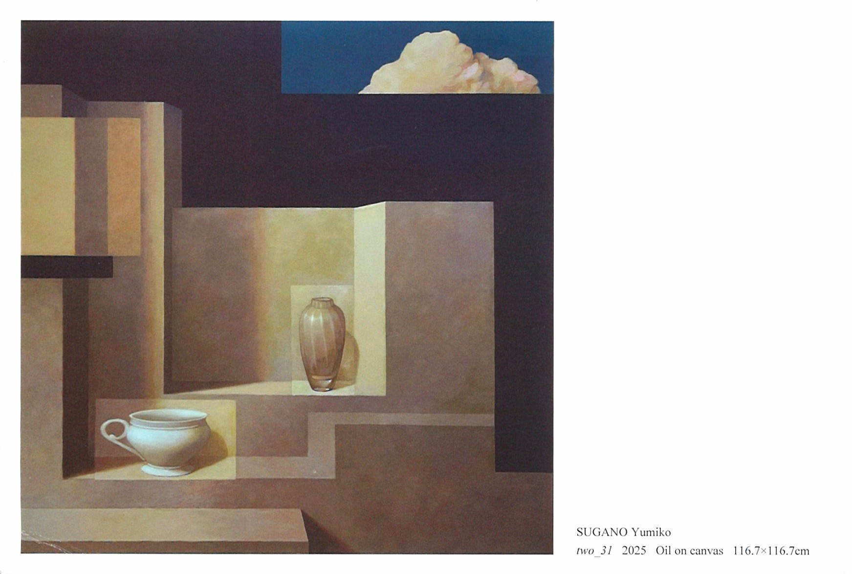 今回の新作では複雑な画面構成に加え、空間の奥の闇を窓のように切り取った先に真夏のような青空と雲が描かれています。思いがけず現れた空は、これまでどこまでも続く迷宮のような閉じられた空間を思わせていた画面を一気に広がりのあるものへと変化させました。2年ぶりとなる本展では、油彩の新作12点を発表いたします。身近にある何気ない器をモチーフに様々な思いが広がる菅野の世界。今回もお見逃しなくぜひご高覧ください。