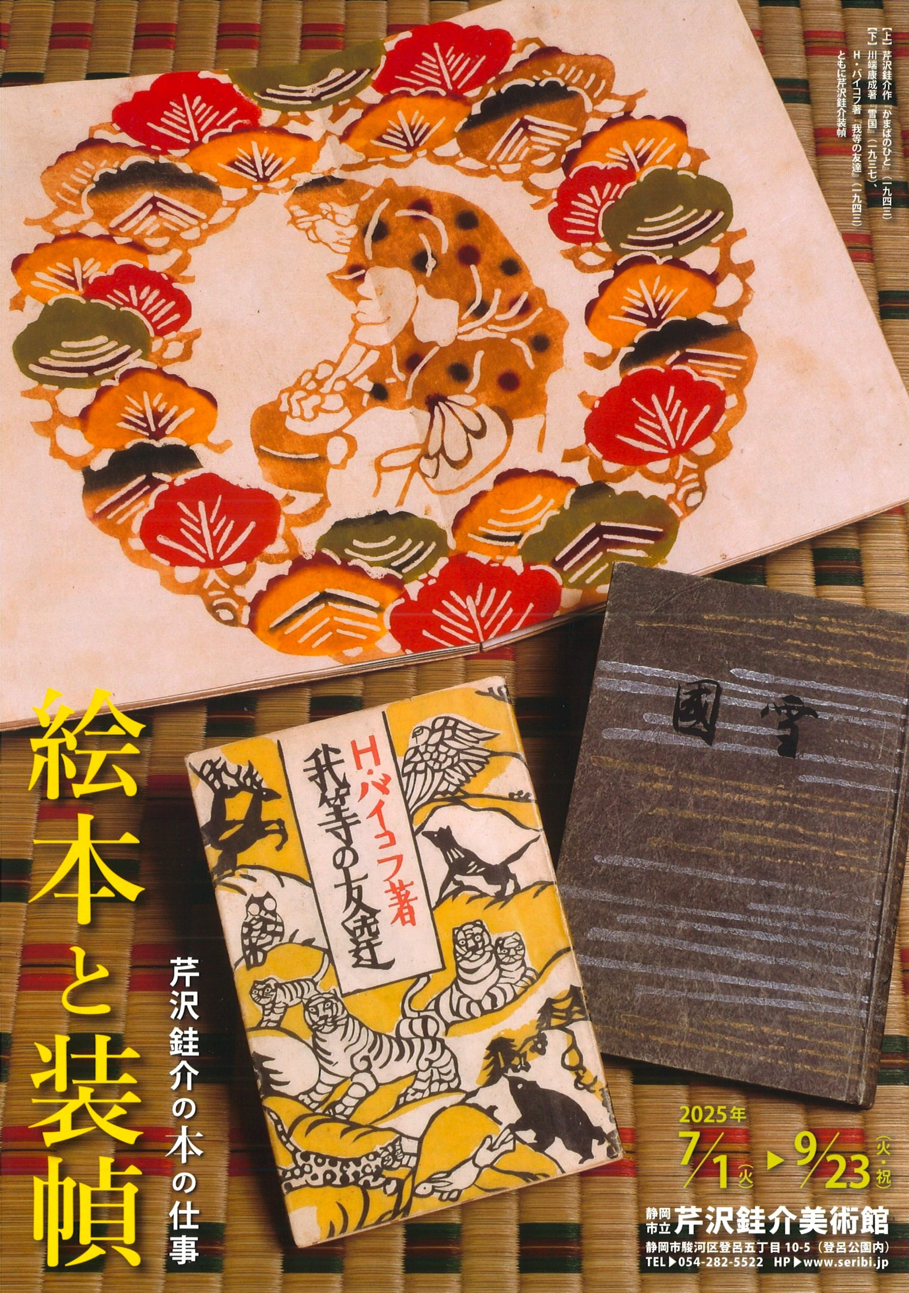 染色家として知られる芹沢銈介ですが、絵本や装幀(ブックデザイン)など、本に関する膨大な仕事も残しています。絵本作家としては、『絵本どんきほうて』や『沖縄風物』など、50冊以上にのぼる絵本を残しました。1ページ1ページ、型染や合羽刷などの技法によって表現したもので、表紙や製本にも徹底的にこだわった手仕事の絵本です。また優れた装幀家としても知られ、型染や肉筆などを駆使して、川端康成著『雪国』や獅子文六著『可否道』をはじめとする、単行本や雑誌など500冊以上をデザインしました。加えて数多くの挿絵や小間絵(カット)も手がけています。この展覧会では、絵本と装幀本150点を中心に展示し、芹沢が活躍したもうひとつのフィールド、本の仕事をご覧いただきます。