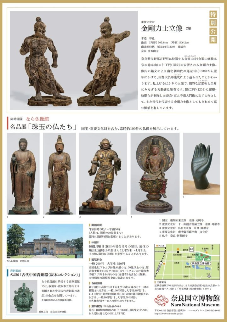 この金剛力士像は、金峯山寺仁王門(国宝)に安置される像高5メートルに達する巨像で、国宝・重要文化財に指定されているものの中では東大寺南大門像に次いで2番目に大きい像です。