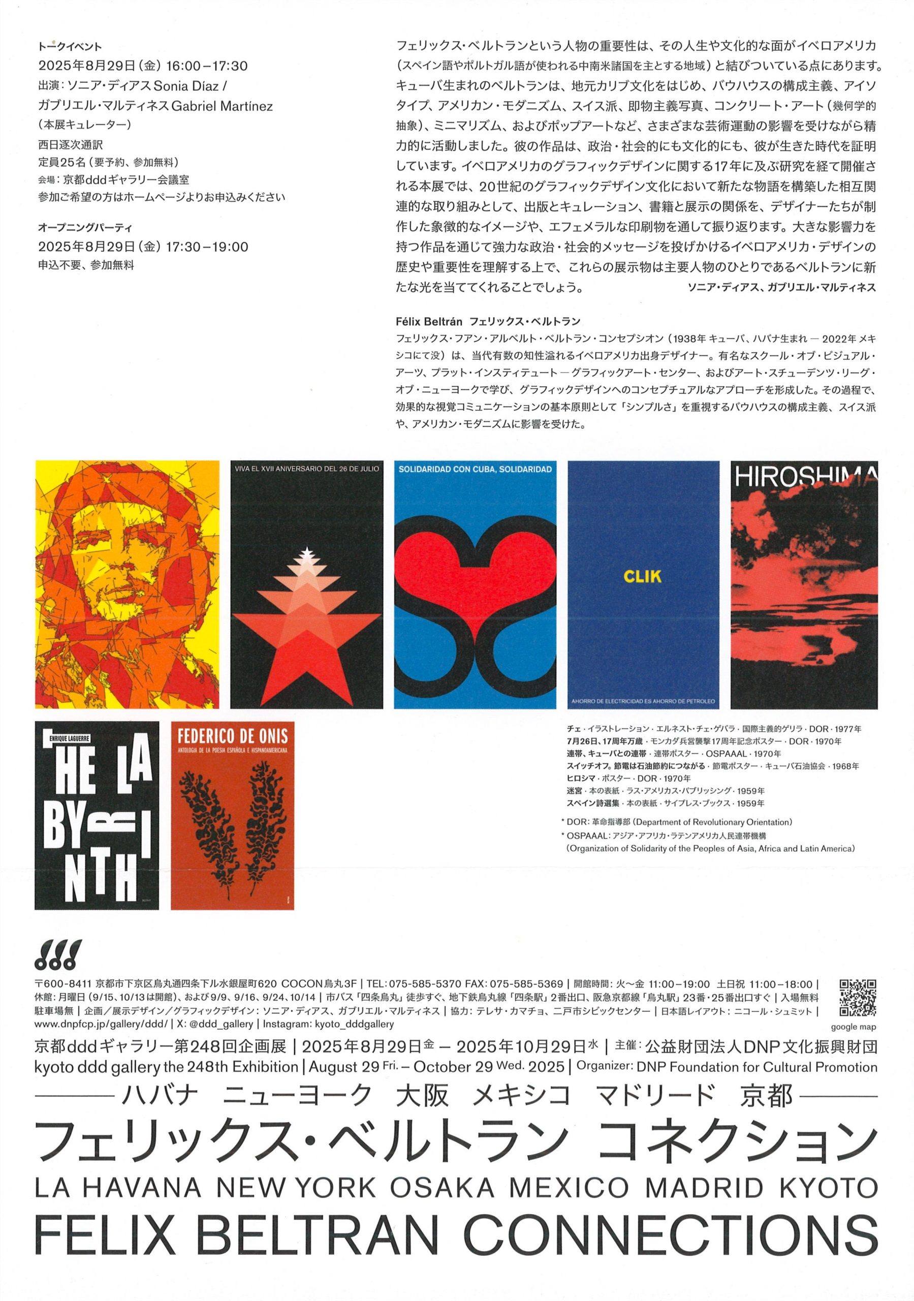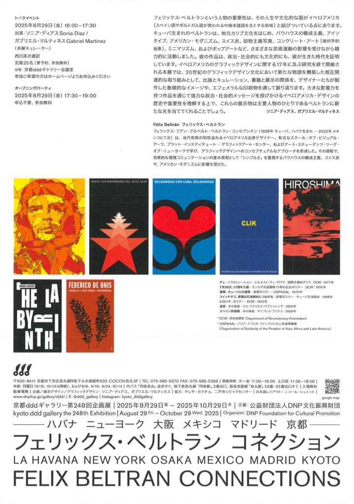 フェリックス・ベルトランという人物の重要性は、その人生や文化的な面がイベロアメリカ(スペイン語やポルトガル語が使われる中南米諸国を主とする地域)と結びついている点にあります。キューバ生まれのベルトランは地元カリブ文化をはじめ、バウハウスの構成主義、アイソタイプ、アメリカン・モダニズム、スイス派、即物主義写真、コンクリート・アート(幾何学的抽象)、ミニマリズム、およびポップアートなど、さまざまな芸術運動の影響を受けながら精力的に活動しました。彼の作品は政治・社会的にも文化的にも、彼が生きた時代を証明しています。イベロアメリカのグラフィックデザインに関する17年に及ぶ研究を経て開催される本展では、20世紀のグラフィックデザイン文化において新たな物語を構築した相互関連的な取り組みとして、出版とキュレーション、書籍と展示の関係を、デザイナーたちが制作した象徴的なイメージや、エフェメラルな印刷物を通して振り返ります。大きな影響力を持つ作品を通じて強力な政治・社会的メッセージを投げかけるイベロアメリカ・デザインの歴史や重要性を理解する上で、これらの展示物は主要人物のひとりであるベルトランに新たな光を当ててくれることでしょう。