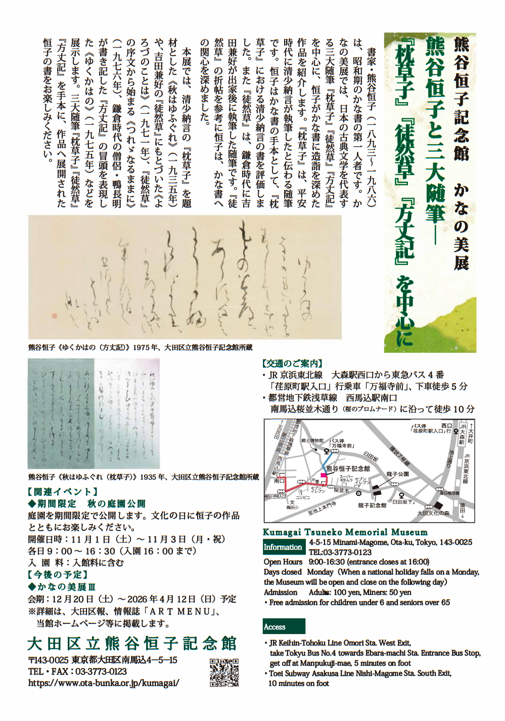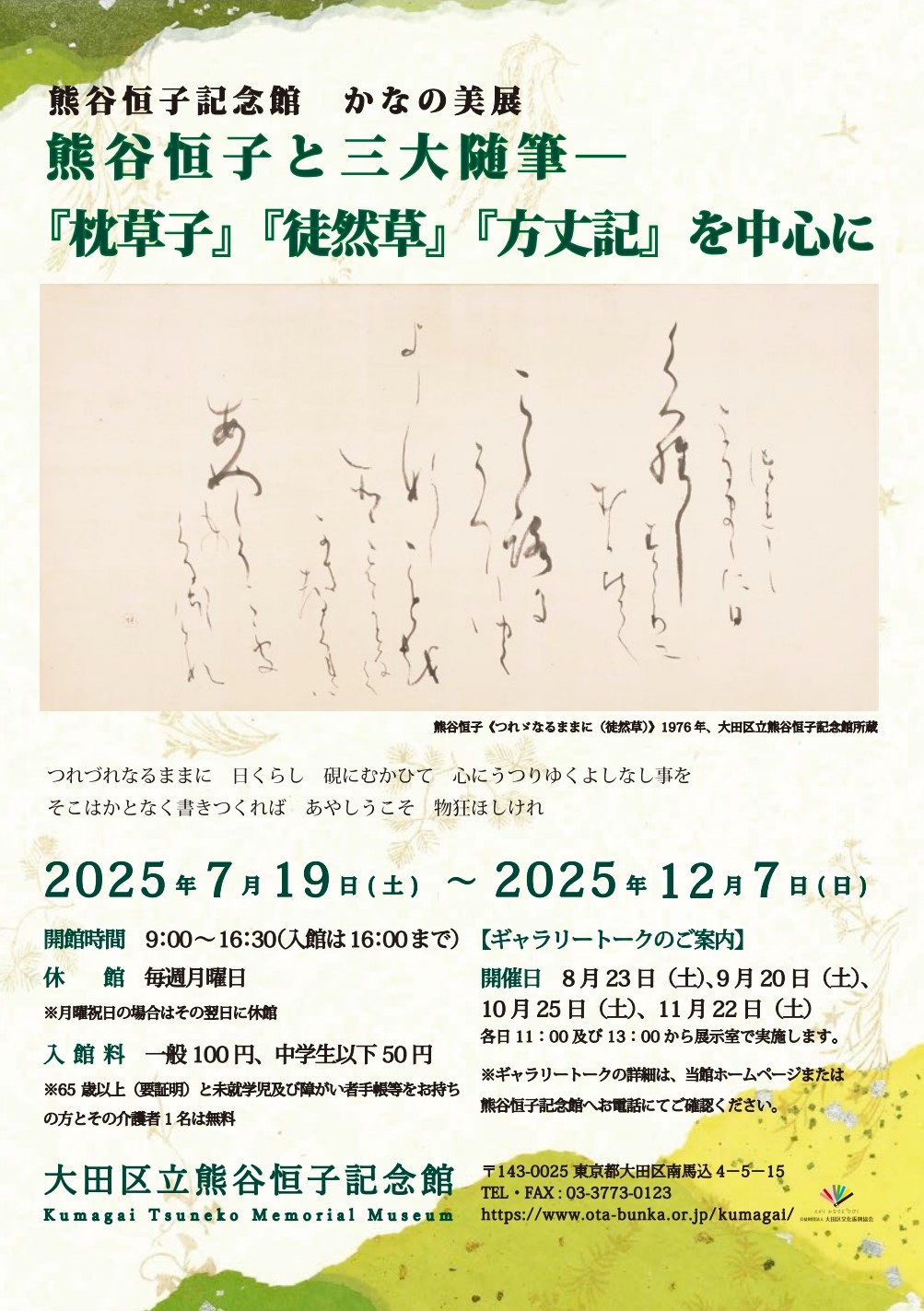 【展覧会】大田区立熊谷恒子記念館|熊谷恒子記念館 かなの美展|熊谷恒子と三大随筆―『枕草子』『徒然草』『方丈記』を中心に|’25年7月19日-12月7日|終了