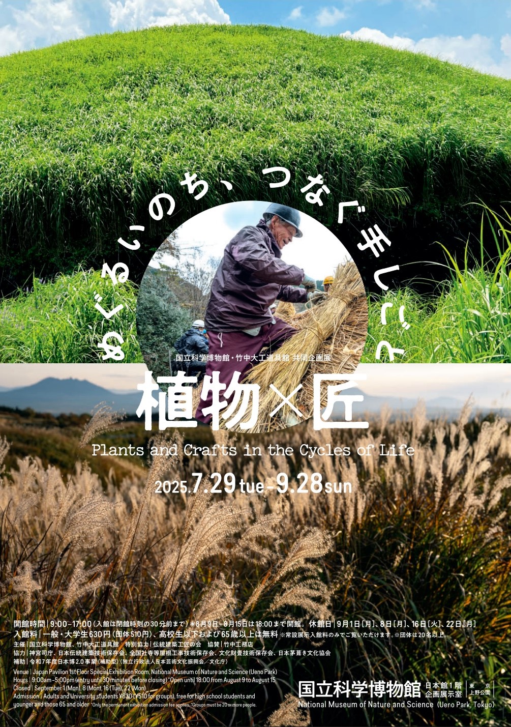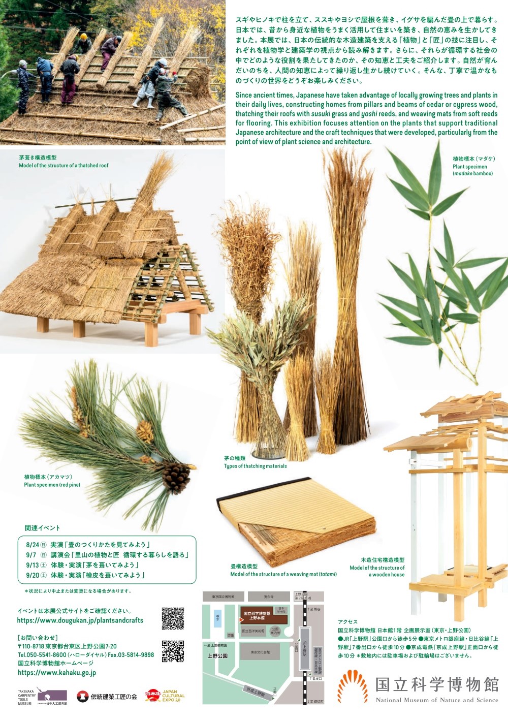スギやヒノキで柱を立て、ススキやヨシで屋根を葺き、イグサを編んだ畳の上で暮らす。日本では、昔から身近な植物をうまく活用して住まいを築き、自然の恵みを生かしてきました。本展では、日本の伝統的な木造建築を支える「植物」と「匠」の技に注目し、それぞれを植物学と建築学の視点から読み解きます。さらに、それらが循環する社会の中でどのような役割を果たしてきたのか、その知恵と工夫をご紹介します。自然が育んだいのちを、人間の知恵によって繰り返し生かし続けていく―。そんな、丁寧で温かなものづくりの世界をどうぞお楽しみください。