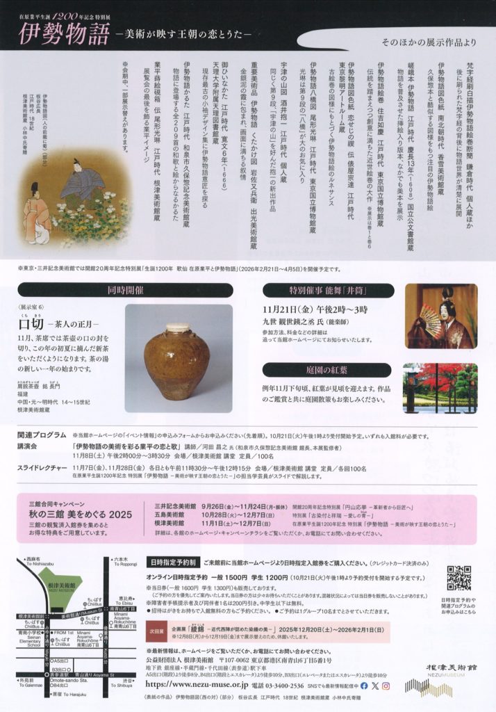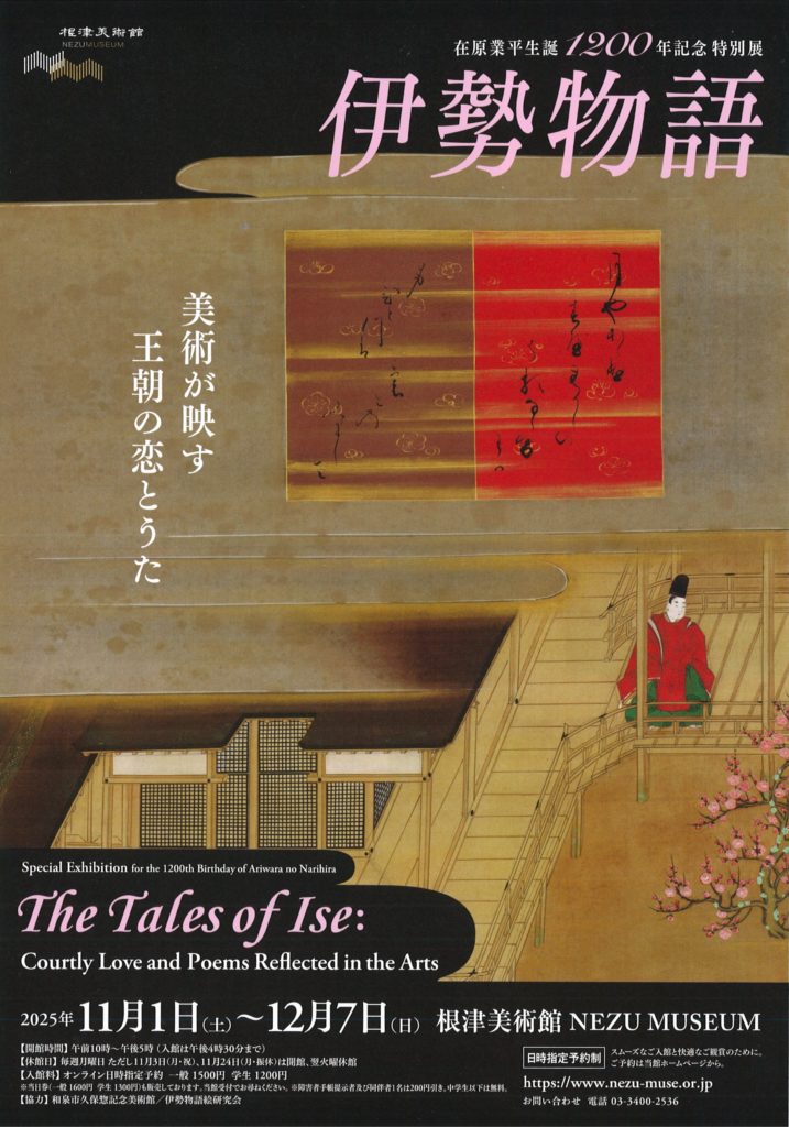 2025年は業平の生誕1200年にあたります。それを記念して『伊勢物語』が生み出した書、絵画、工芸を一堂に集める展覧会を開催します。『伊勢物語』の核心をなす和歌に焦点をあわせ、それを味わいながら、また『伊勢物語』の造形化における和歌の働きに注目しながら、ご覧いただきます。