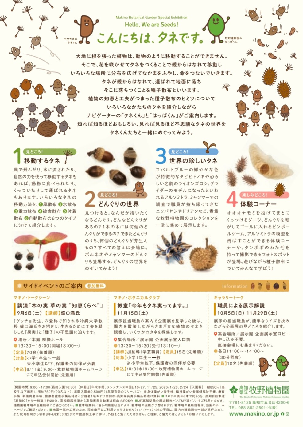 大地に根を張り動かない植物が、仲間をふやす知恵と工夫がつまったタネの移動方法「種子散布」のヒミツについて、いろいろなタイプのタネを取り上げながら紹介します。そして、ナビゲーターの「タネくん」と「はっぱくん」が皆さんをタネの世界に案内します。ひとことで “タネ” といっても形や特徴はさまざま。