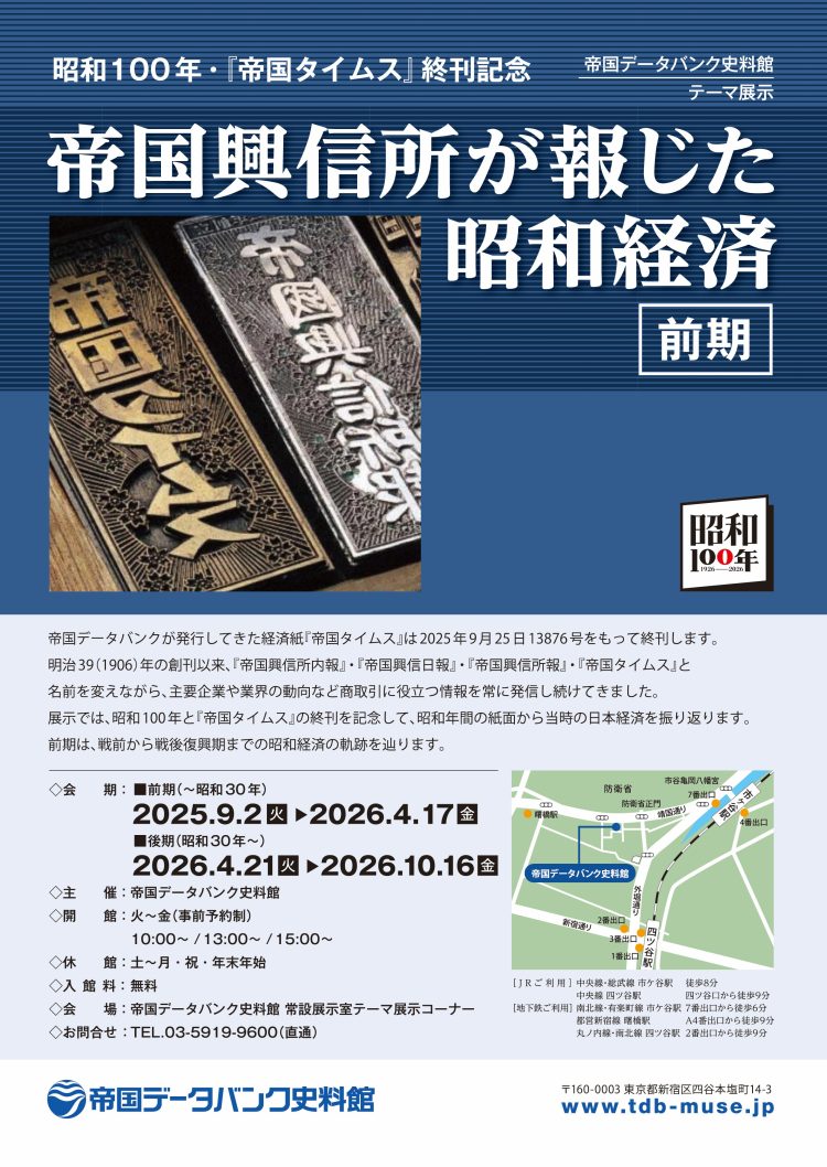 展示では、昭和100年と『帝国タイムス』の終刊を記念して、昭和年間の紙面から当時の日本経済を振り返ります。