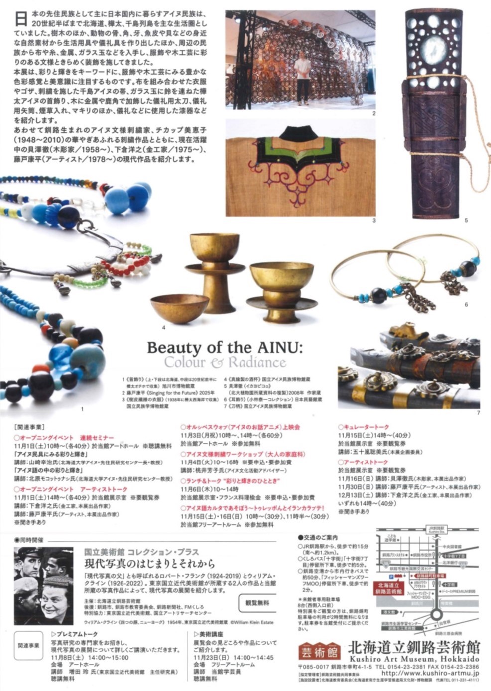 アイヌ民族は北海道、樺太南部、千島列島をおもな活動圏として、周囲の民族と交易や交流を行うなかで独自の文化を発展させました。本展では「彩りと輝き」をキーワードに、装飾性豊かな衣服や装身具、ゴザ、木に金属や鹿角などを組み合わせた儀礼用太刀、儀礼用矢筒、煙草入れなどを紹介します。
