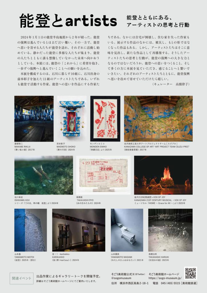 2024年1月1日の能登半島地震から2年が経った。能登の復興は進んでいるとはまだ言い難い。その一方で、能登へ思いを寄せる人たちが能登を訪れ、それぞれに活動し始めている。静かだった能登に多様な人たちが集まり、能登の人たちとともに誰も想像していなかった未来へ向かおうとしている。本展には、能登の「これから」に希望を抱き、一歩ずつ復興へと進んでいくことへの願いを込めた。