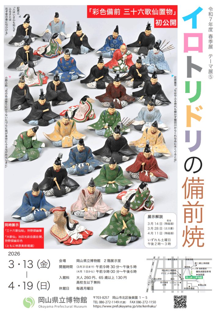 今回のテーマ展では、彩色備前(絵具で着色した備前焼)の代表作と語り継がれながらも、いつしか行方がわからなくなり、研究者が探し求めていた「彩色備前 三十六歌仙置物」を、関連作品とともにご紹介します。なお、全容がわかる状態で本作が公開されるのはこのたびが初めてとなります。