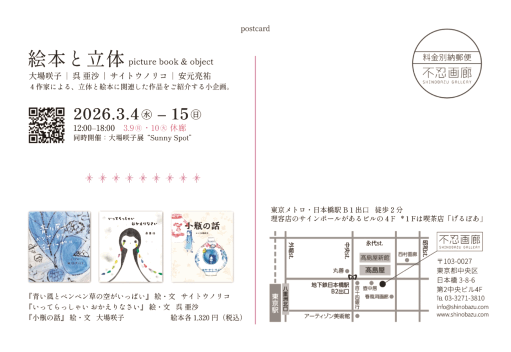 【展覧会】不忍画廊|大場咲子個展 “Sunny Spot”|同時開催:絵本と立体|’26年3月4日-3月15日