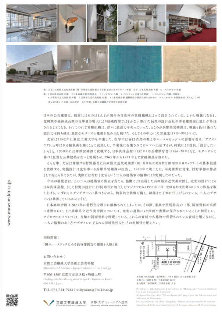 日本真珠会館は2023 年に老朽化を理由に解体されてしまったが、その際、家具や照明器具の一部、図面資料が当館に寄贈された。また兵庫県立近代美術館については、光安の遺族により図面や書簡が保存されていることが判明した。