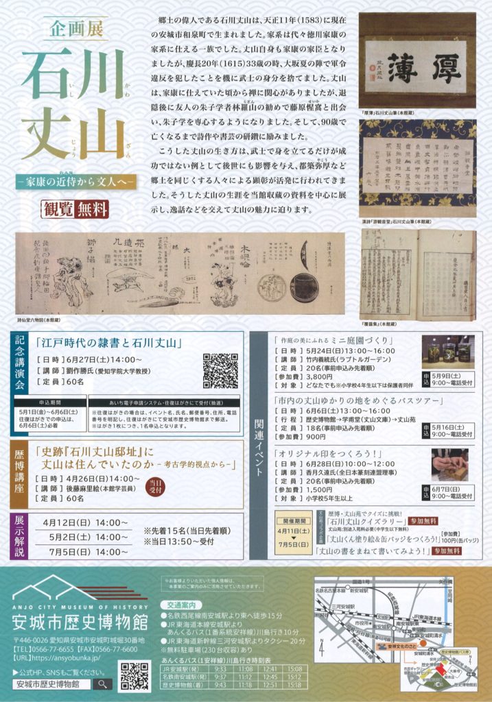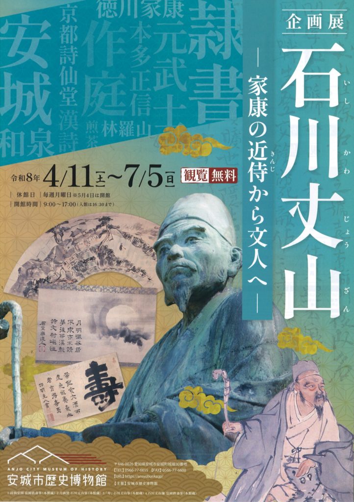郷土の偉人である石川丈山は、天正11年(1583)に現在の安城市和泉町で生まれました。家系は代々徳川家康の家系に仕える一族でした。丈山自身も家康の家臣となりましたが、慶長20年(1615)33歳の時、大坂夏の陣で軍令違反を犯したことを機に武士の身分を捨てました。丈山は、家康に仕えていた頃から禅に関心がありましたが、退隠後に友人の朱子学者林羅山の勧めで藤原惺窩と出会い、朱子学を専心するようになりました。そして、90歳で亡くなるまで詩作や書芸の研鑽に励みました。