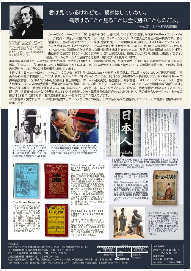 今も私たちを魅了してやまないシャーロック・ホームズの世界を、ドイル原作ホームズ譚の英文古書、 「STRAND MAGAGINE」初出掲載誌、ホームズ研究英文、各国語訳、邦訳古書、パロディー/パスティーシュ 、児童向け本などに加え、ホームズ像、パイプ、虫めがねなど関連資料を含む約300点により紹介します。日本シャーロック・ホームズ・クラブを1977年に設立した故小林司(元上智大カウンセリング 研究所教授)・東山あかね夫妻のコレクション。