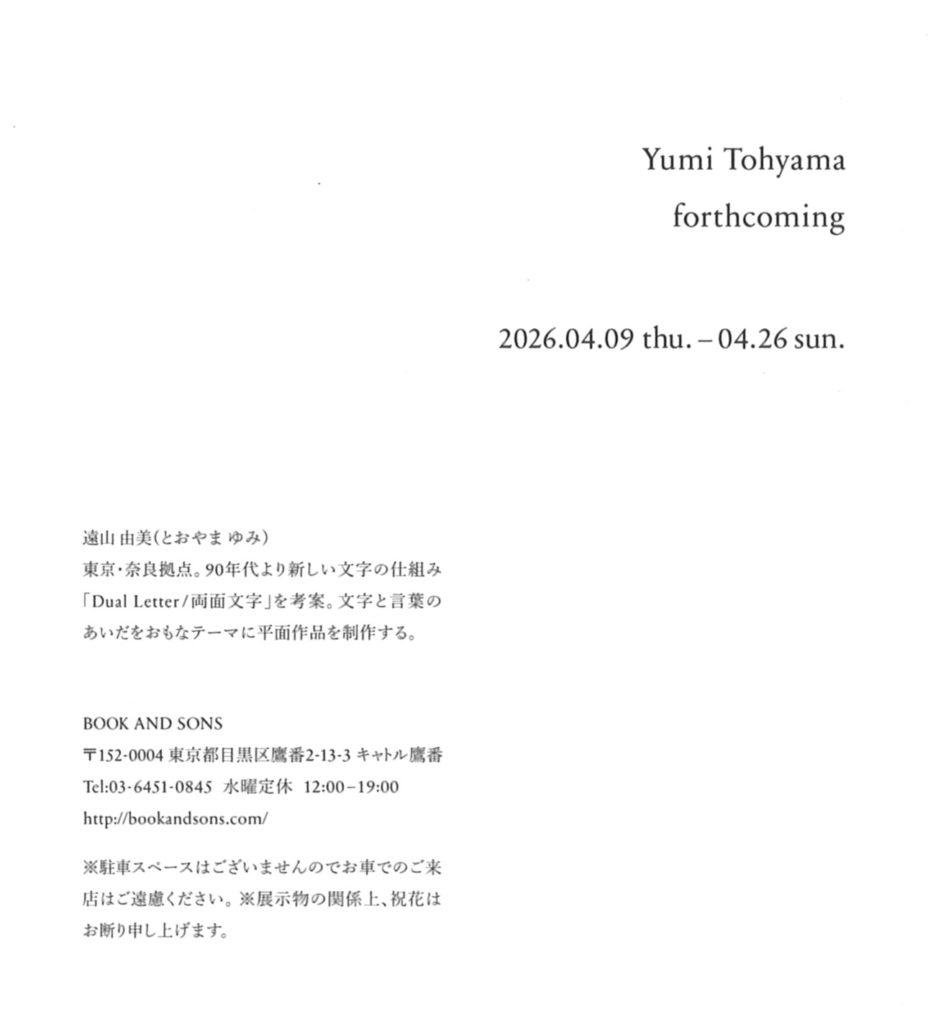 2026年4月9日[木]より、BOOK AND SONS 3Fにて、文字美術作家・遠山由美による作品展「forthcoming」を開催いたします。本展は新刊『99の音のスケッチ』の刊行にあわせ、その制作過程から生まれた作品を中心に展示いたします。