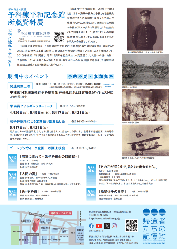予科練平和記念館は、予科練の歴史や阿見町(茨城県)の戦史の記録を保存・展示するとともに、次の世代に正確に伝承し、命の尊さや大切さを考えていただくことを目的として、2010(平成22)年に開館し、昨年15周年を迎えました。本交流展では、大空への憧れを胸に予科練生となった少年たちが受けた訓練・教育や日々の生活、戦後の様相を、予科練平和記念館の所蔵する資料を通して紹介します。