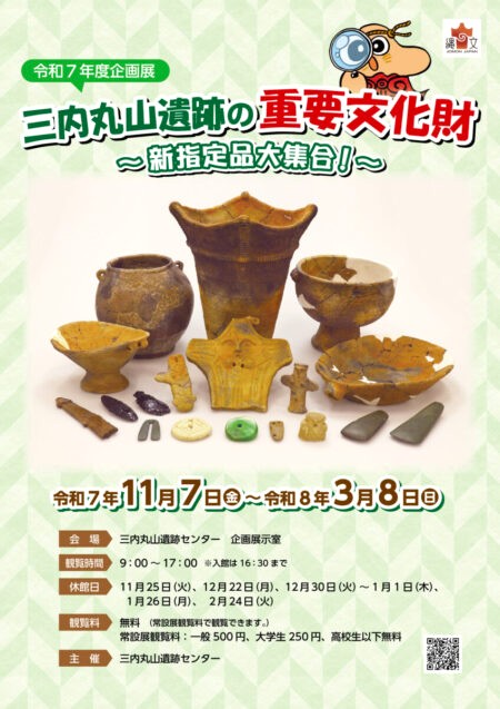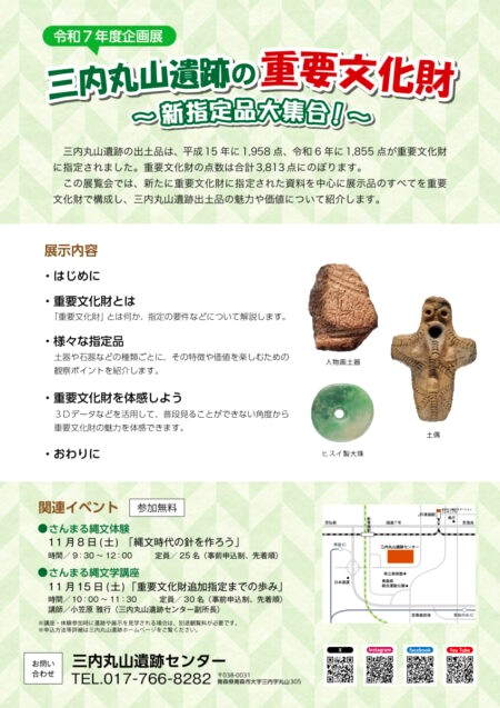 特別史跡・三内丸山遺跡の出土品は、平成15年に1,958点が初めて重要文化財に指定されました。また、令和6年8月には新たに1,855点が重要文化財に指定されたことから、重要文化財の点数は、既指定の出土品と合わせて合計3,813点にのぼります。