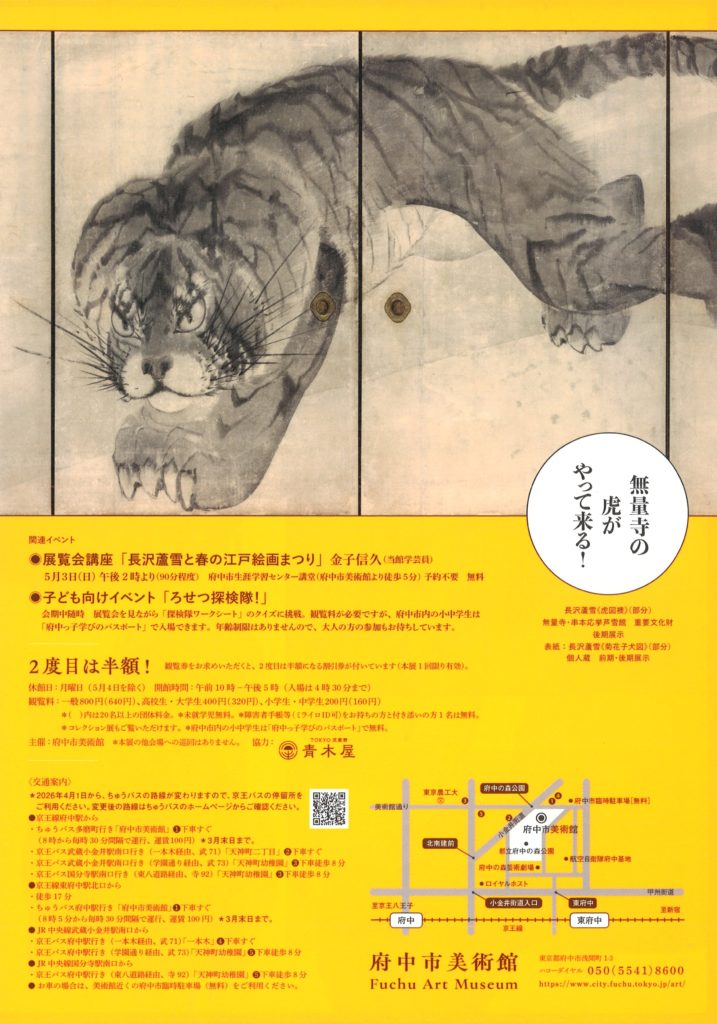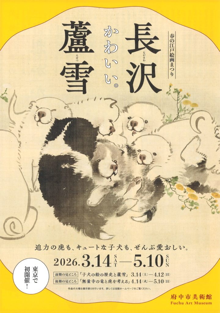 府中市美術館では2001年秋に「司馬江漢 -しば こうかん- の絵画 西洋との接触、葛藤と確信」を開催し、その後、2005年の「百花の絵」以降、毎年春に江戸絵画を中心とする展覧会を開催してきました。都立府中の森公園の桜や若葉とともに春の風物詩としてお楽しみいただけたら、との願いもあり、途中から「春の江戸絵画まつり」と呼ぶようになりました。このシリーズは今回で幕を下ろしますが、シリーズに欠かせなかった画家の一人が、江戸時代中期の画家、長沢蘆雪〔ながさわ ろせつ 1754-1799〕です。
