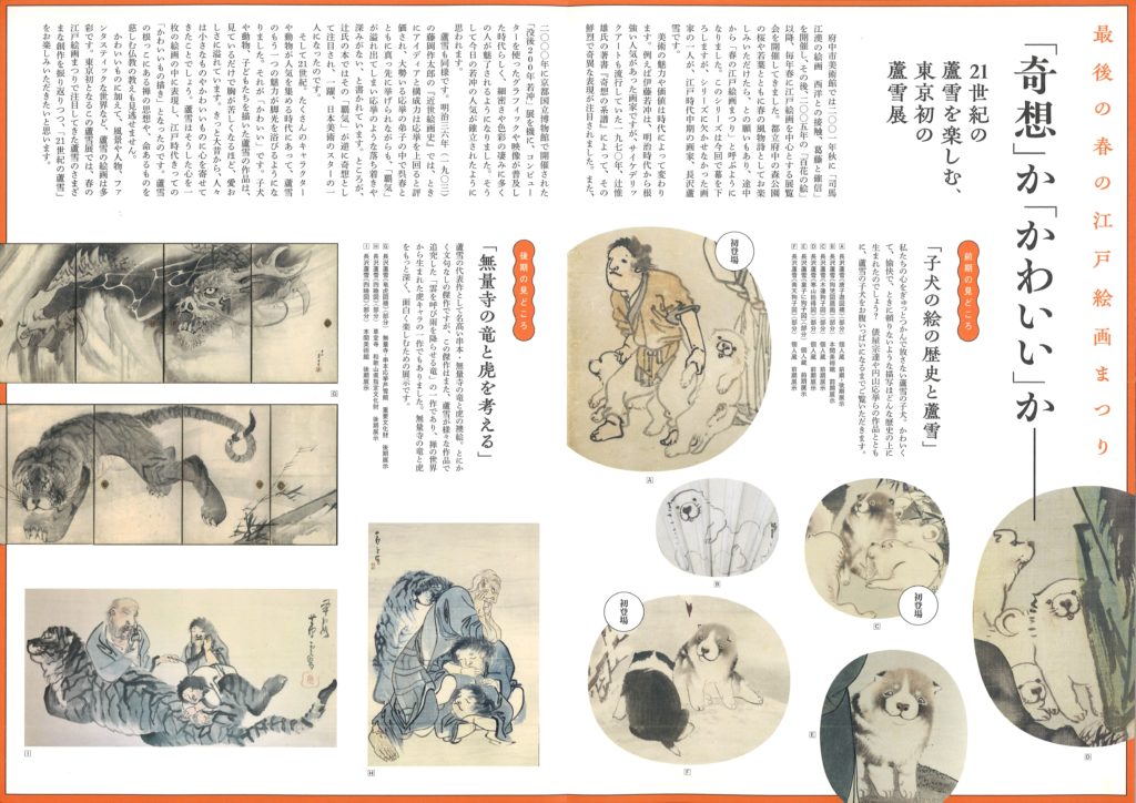 かわいいものに加えて、風景や人物、ファンタスティックな世界など、蘆雪の絵画は多彩です。東京初となるこの蘆雪展では、春の江戸絵画まつりで注目してきた蘆雪のさまざまな創作を振り返りつつ、「21世紀の蘆雪」をお楽しみいただきたいと思います。