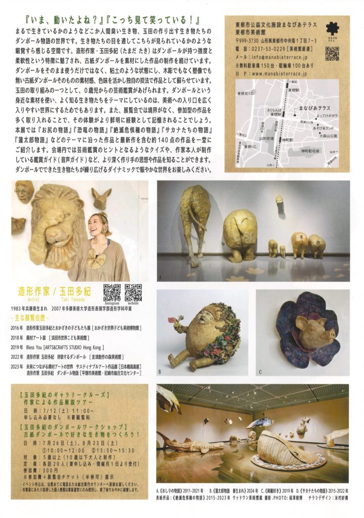 1980年、兵庫県に生まれる。三重県北部の古い民家にアトリエを構え、クスノキを素材に使い、動物たちのそのままの姿を木彫りにする。各地の美術館で木彫りの動物たちと間近で触れ合える展覧会を開催するほか、動物たちの肖像制作、フィギュアやオブジェの原型制作や動物たちのイラスト等も手掛ける。