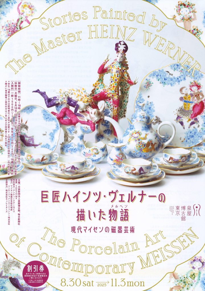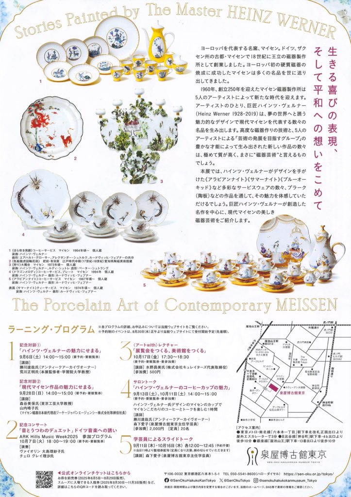 本展では、ハインツ・ヴェルナーがデザインを手がけた《アラビアンナイト》《サマーナイト》《ブルーオーキッド》など多彩なサービスウェアの数々、プラーク(陶板画)などの作品を通して、その魅力を体感していただけるでしょう。巨匠ハインツ・ヴェルナーが創造した名作を中心に、現代マイセンの美しき磁器芸術をご紹介します。