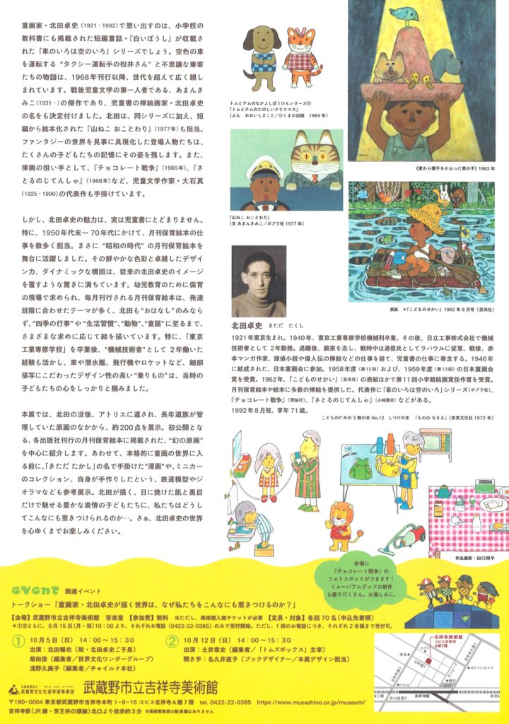 本展では、北田の没後、アトリエに遺され、長年遺族が管理していた原画のなかから、約200点を展示。初公開となる、各出版社刊行の月刊保育絵本に掲載された、“幻の原画” を中心に紹介します。あわせて、本格的に童画の世界に入る前に、「きただ たかし」の名で手掛けた “漫画” や、ミニカーのコレクション、自身が手作りしたという、鉄道模型やジオラマなども参考展示。