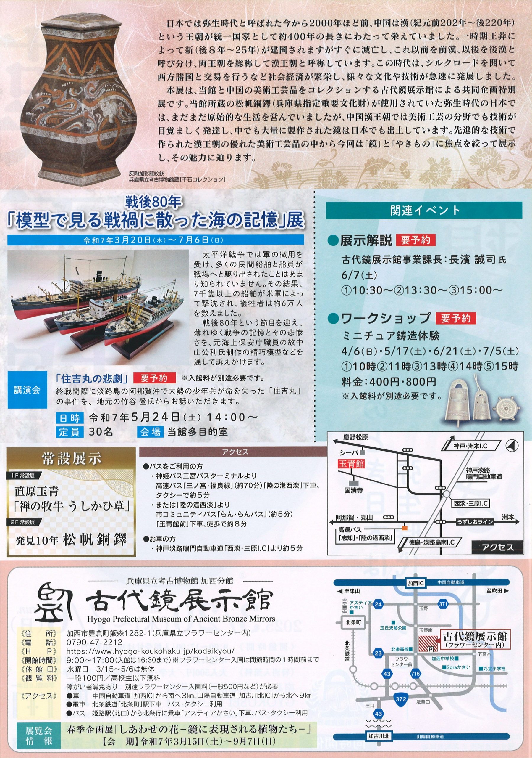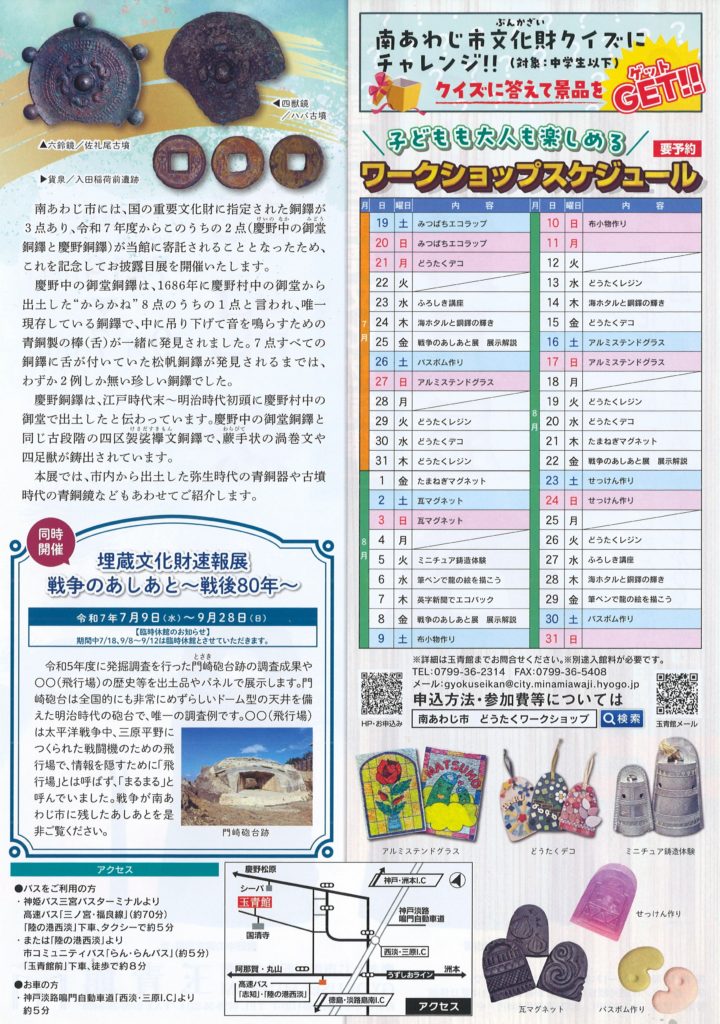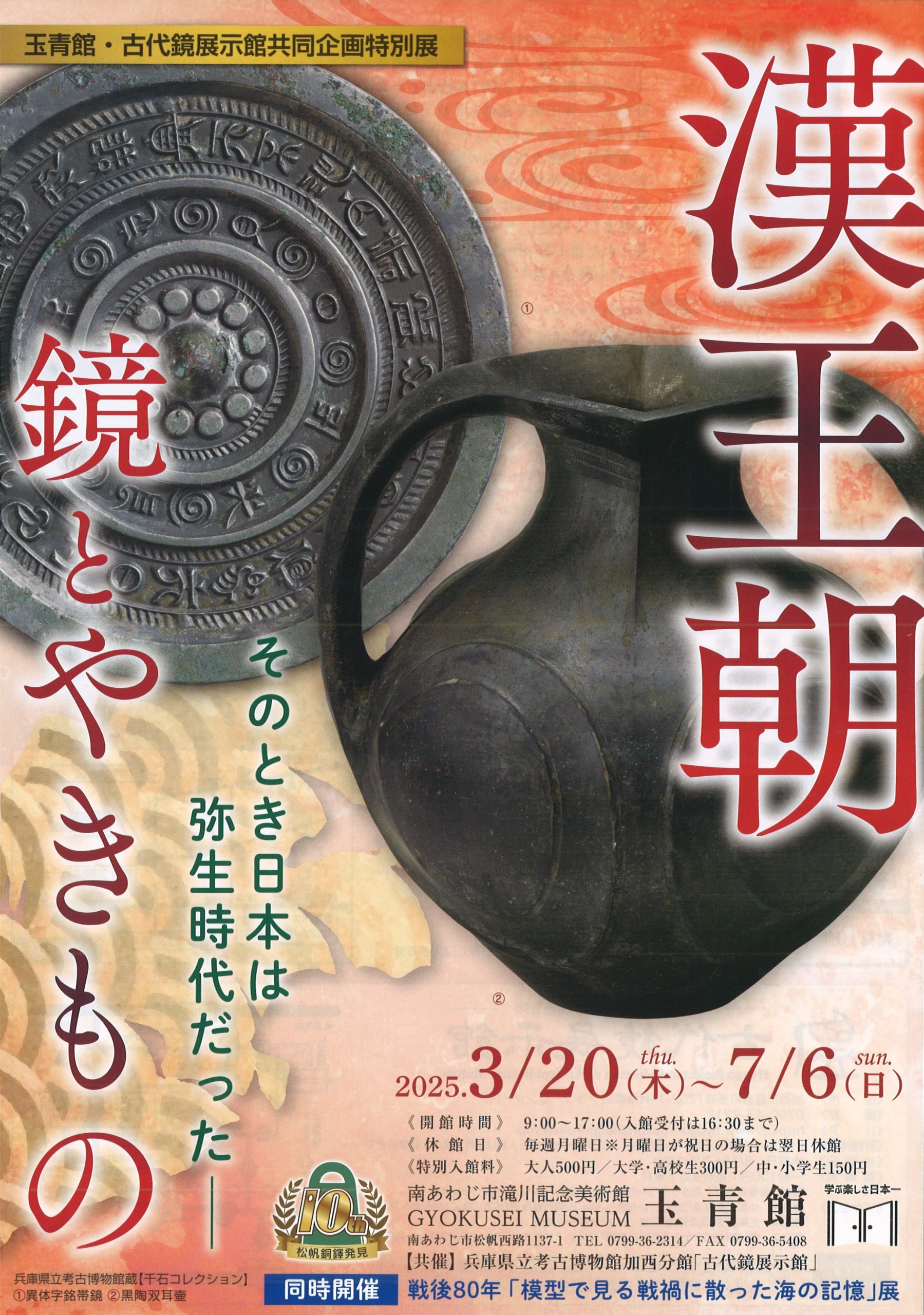 弥生時代に淡路島で銅鐸祭祀が盛んだった頃に、伊予地域(愛媛県)で祭祀の道具として使われていた分銅形土製品や、龍や鹿・船などが描かれた絵画土器、平形銅剣などを展示紹介いたします。是非ご覧ください。