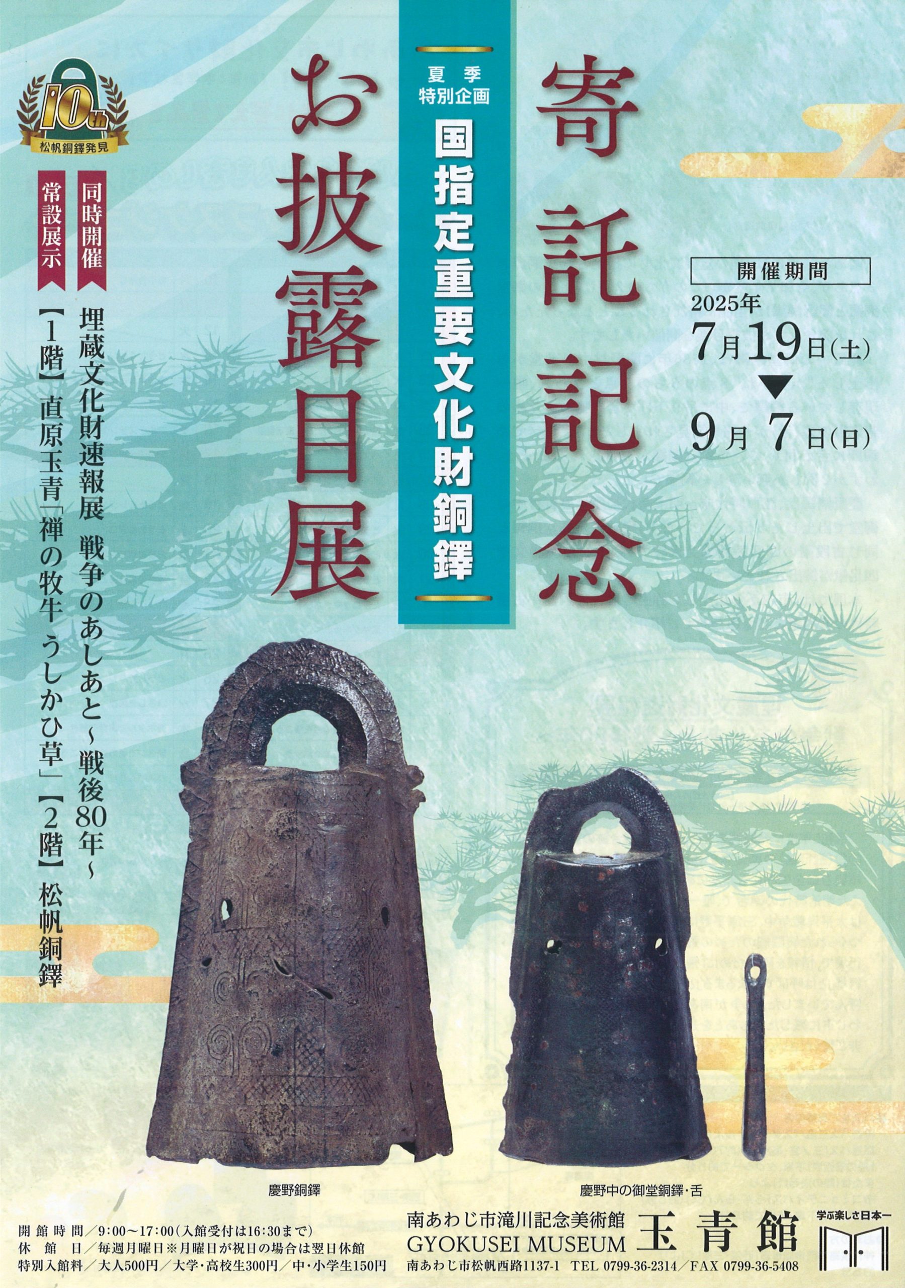 令和2年度からは、平成27年に市内で発見された松帆銅鐸の展示室を2階に開設し、現在は、松帆銅鐸7点・舌7本や歴史資料を常設展示しています。