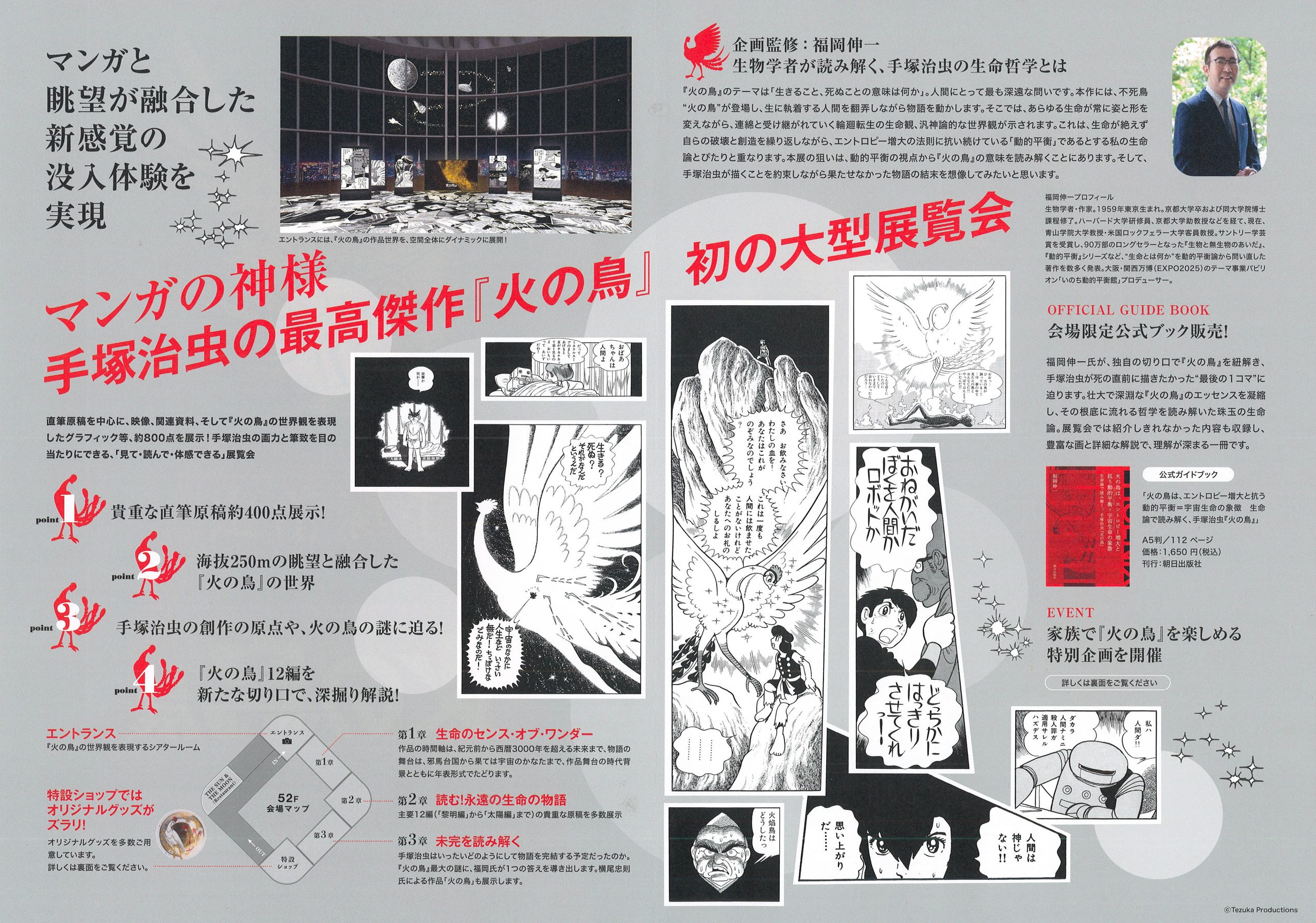 『火の鳥』の連載開始から70年が経過した今、生物学者・福岡伸一氏を道先案内人として、新たな生命論の視点から『火の鳥』の物語構造を読み解き、手塚治虫が生涯をかけて表現し続けた「生命とは何か」という問いの答えを探求します。