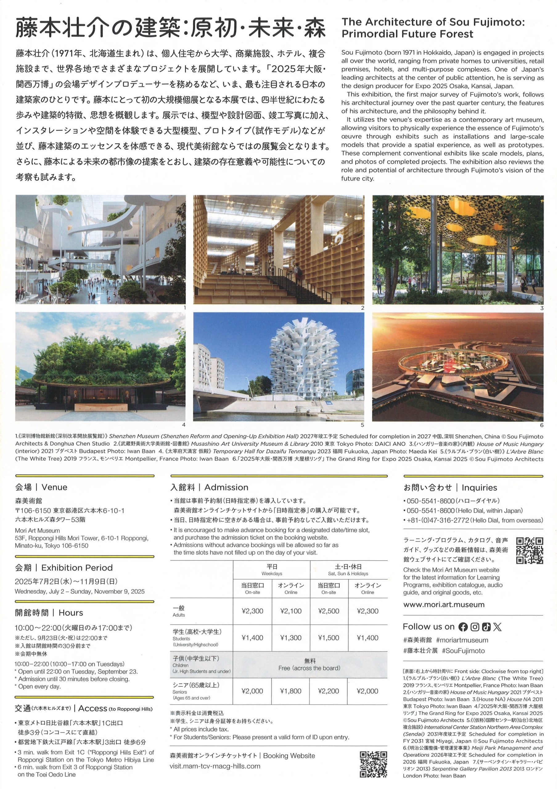 藤本壮介(1971年、北海道生まれ)は東京とパリ、深圳に設計事務所を構え、個人住宅から大学、商業施設、ホテル、複合施設まで、世界各地でさまざまなプロジェクトを展開しています。2000年の《青森県立美術館設計競技案》で注目を集めたのち、《武蔵野美術大学美術館・図書館》(2010年、東京)、《サーペンタイン・ギャラリー・パビリオン2013》(ロンドン)、近年では集合住宅《ラルブル・ブラン(白い樹)》(2019年、フランス、モンペリエ)や音楽複合施設《ハンガリー音楽の家》(2021年、ブダペスト)などのプロジェクトを次々と完成させ、高い評価を得てきました。現在開催中の2025年大阪・関西万博では会場デザインプロデューサーを務めるなど、いま、最も注目される日本の建築家の一人です。