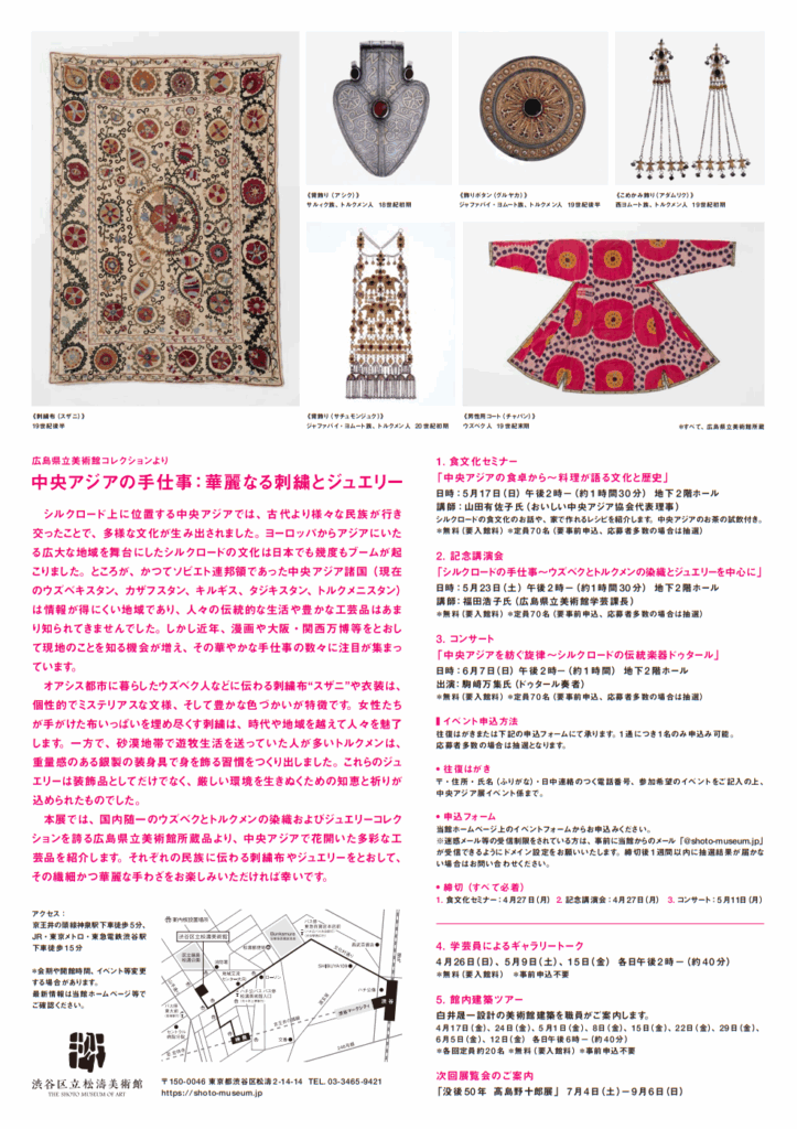 シルクロード上に位置する中央アジアでは、古代より様々な民族が行き交ったことで、多様な文化が生み出されました。ヨーロッパからアジアにいたる広大な地域を舞台にしたシルクロードの文化は日本でも幾度もブームが起こりました。ところが、かつてソビエト連邦領であった中央アジア諸国(現在のウズベキスタン、カザフスタン、キルギス、タジキスタン、トルクメニスタン) は情報が得にくい地域であり、人々の伝統的な生活や豊かな工芸品はあまり知られてきませんでした。しかし近年、漫画や大阪・関西万博等をとおして現地のことを知る機会が増え、その華やかな手仕事の数々に注目が集まっています。
