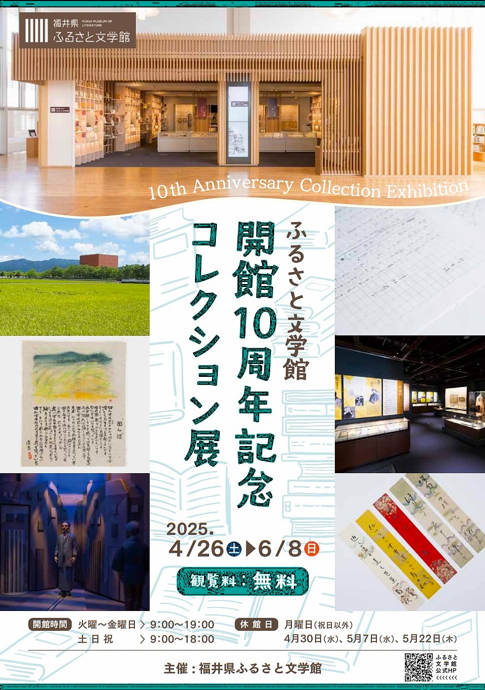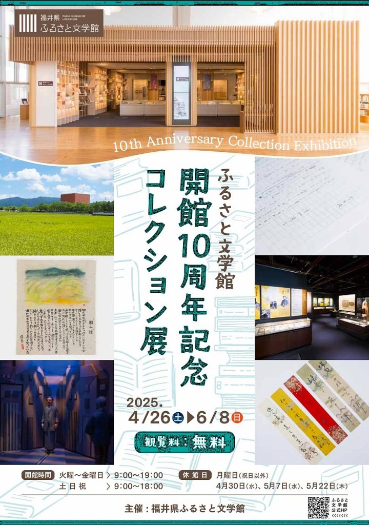 これまで、福ゆかりの作家や福井を描いた作品の資料を収集・保存・展示し、福井の文学を継承していくこと、文学に親しみ、学び、交流できる場を提供することを目指して活動してまいりました。開館10周年となる本年、これまで収集したふるさと文学の名品や、昨年度新しく収蔵した資料を展示します。