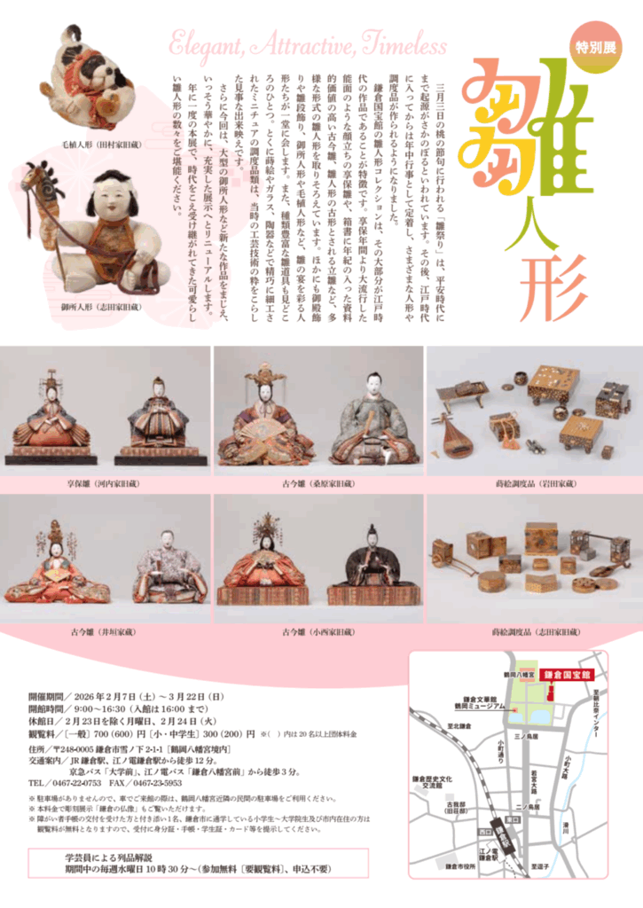 鎌倉国宝館のコレクションは、江戸時代の享保年間より流行した享保雛や製作年の分かる古今雛、ミニチュア調度品など多様な作品を取り揃えています。